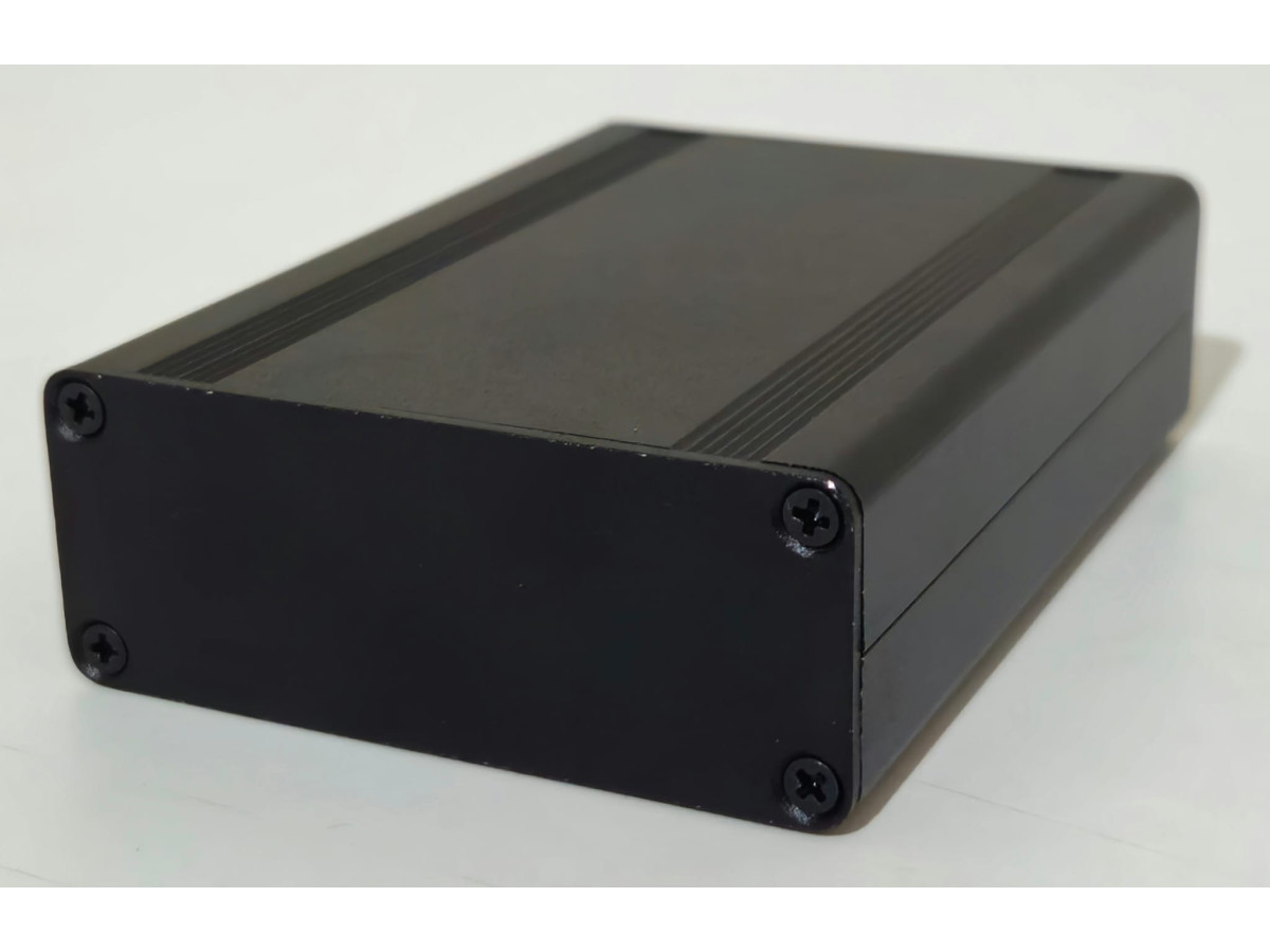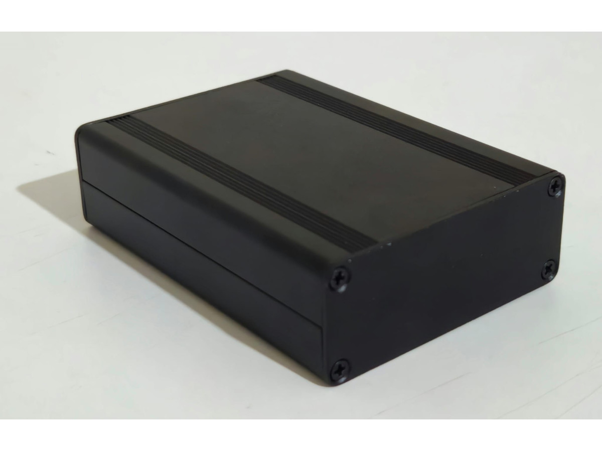 This is an enclosure with blank (un-drilled, un-printed) front and rear panels, that is exactly the same size as the QMX and QCX-mini transceiver enclosures. The size is 63w x 25h x 95d mm. It is custom-manufactured using extruded aluminium profiles with black anodized finish. The enclosure includes four self-adhesive feet and mounting screws.
